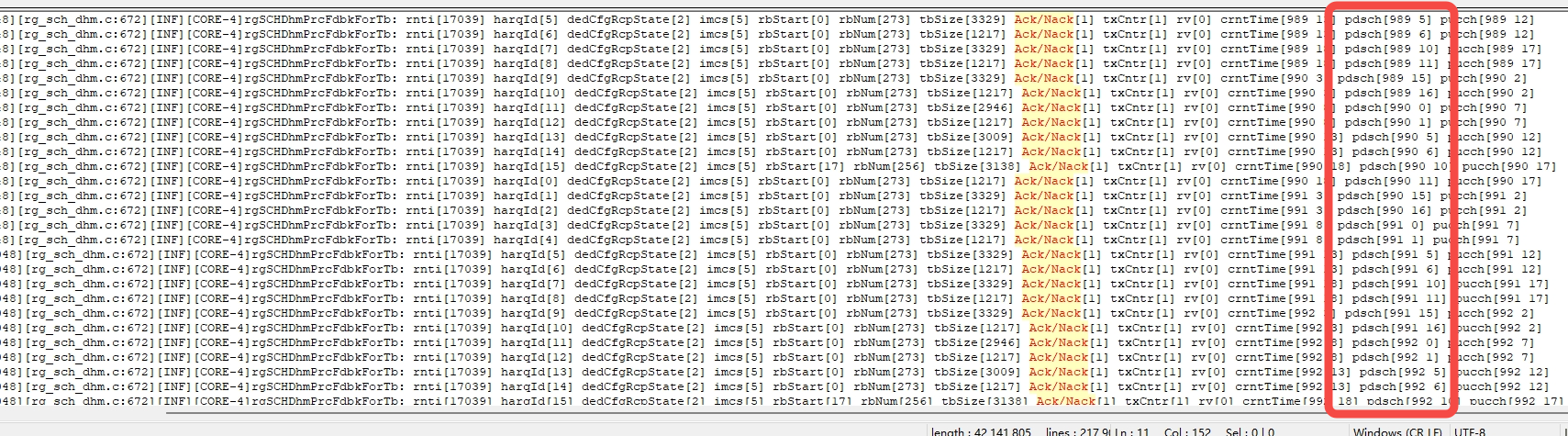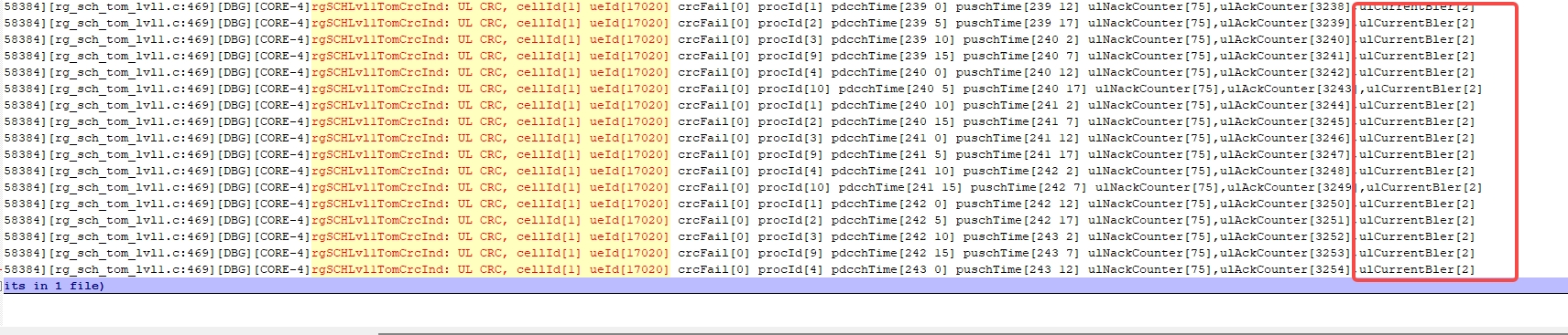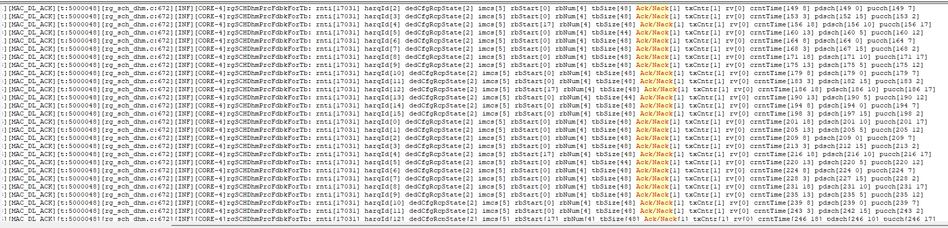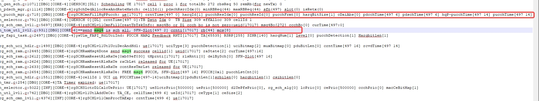 2.然后基站在(254,17)发了一包msg4(rv=0),按理来说UE应该在(129,17)去解一包msg4。但是看LOG,这个时刻并没有去解PDCCH,L1C也没有发数给PDSCH 。