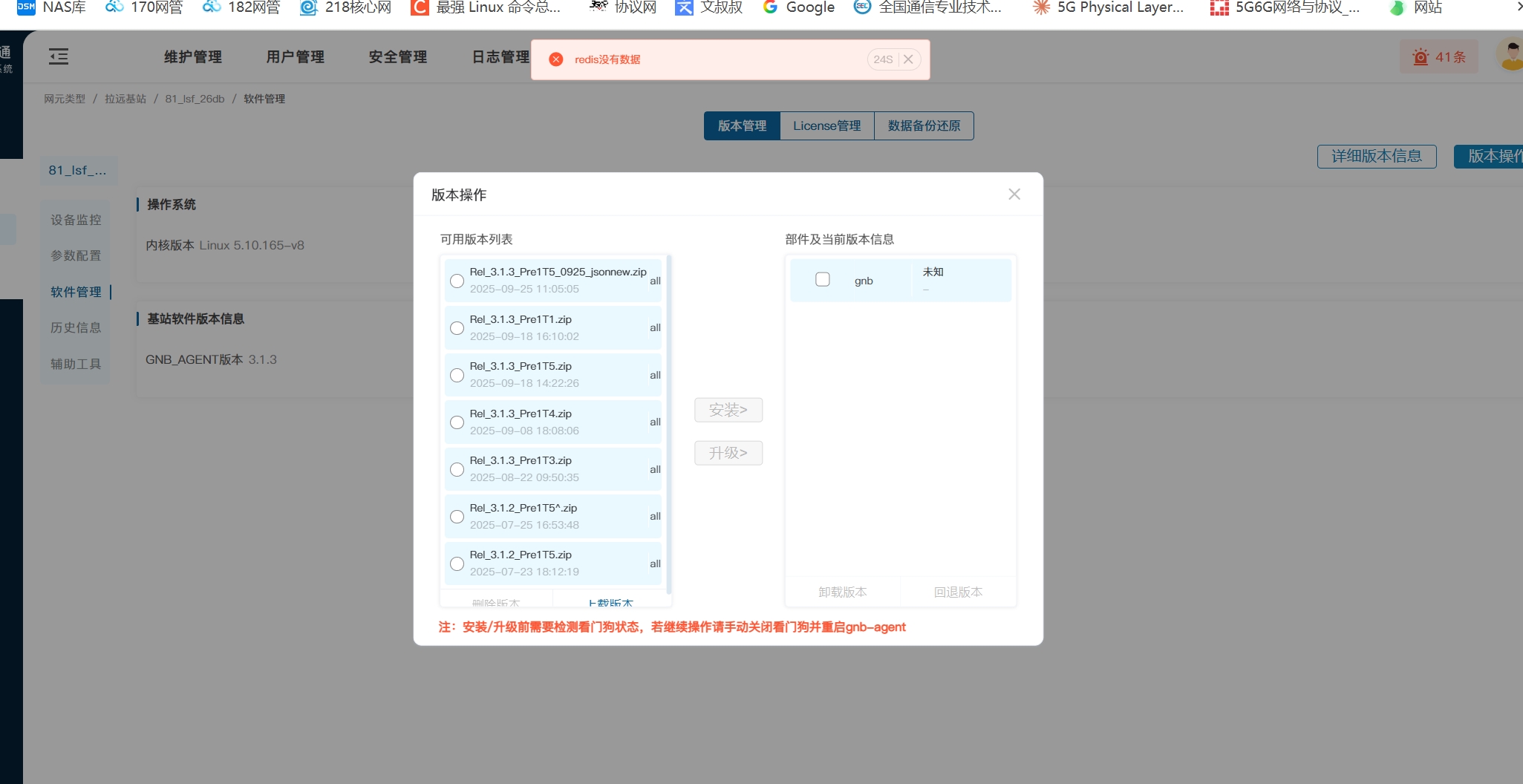 软件版本:基站 - 3.1.3Pre1T5_0925 网管 : YZMM2.2.2大包升级失败,报redis没有数据告警