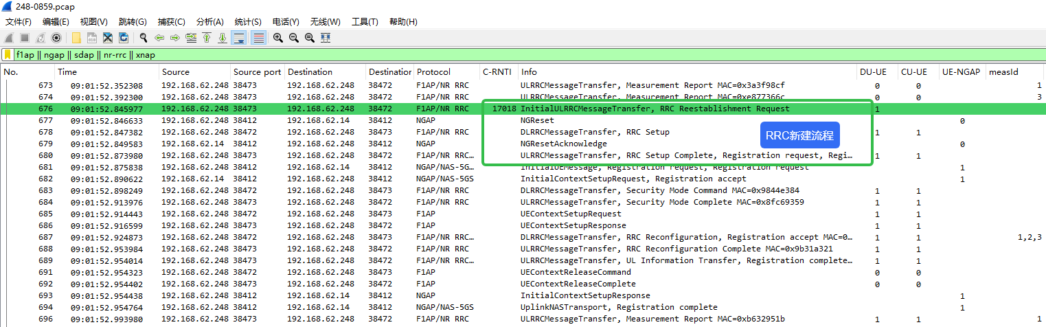 2)在1)基础上,打开"RRC重建立支持开关",置"REEST_TRIGGER_FOR_TEST"开关关闭后再打开,抓包观察UE重建立流程按照实际