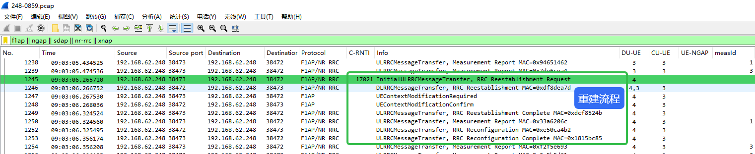 场景2:CU侧配置"RRC重建立支持开关"打开,DU侧配置"REEST_TRIGGER_FOR_TEST"打开,抓包UE重建时走实际重建流程触发,接入正常,同时上下行灌包正常;