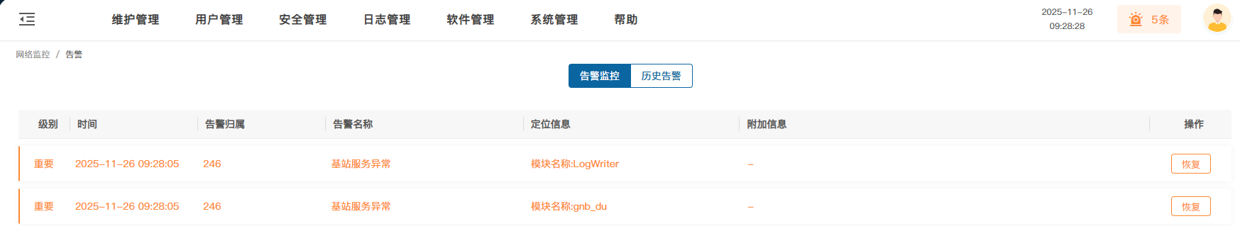 reboot基站后basevservice可正常上报基站服务异常告警