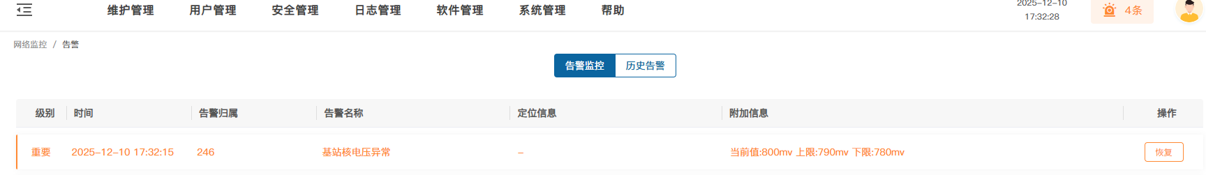 每两秒周期查询基站核电压cat /sys/class/hwmon/hwmon0/ucp_vol_val 单位(mv)小于700mv或者大于800mv则上报告警