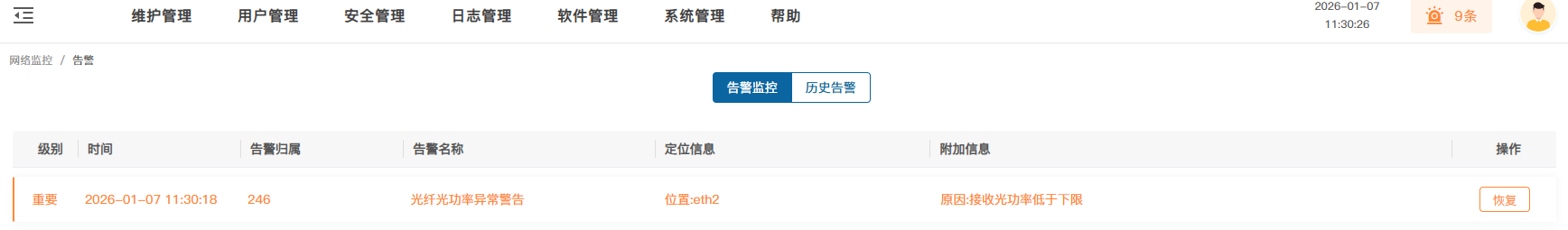 在NMS选择光纤或者网线,选择光纤模式时该告警触发时,上报光纤告警,选择网线模式是该告警触发时,不上报告警光纤异常告警