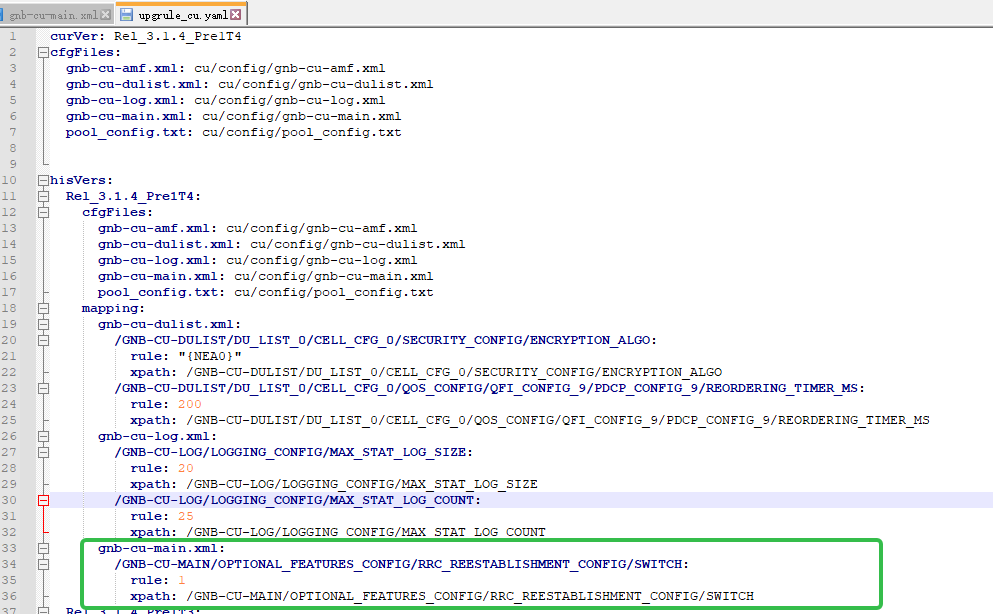 【问题分析】排查发现cu的gnb-cu-main.xml中的“RRC_REESTABLISHMENT_CONFIG”开关是打开的,但是upgrule_cu.yaml文件没记录;