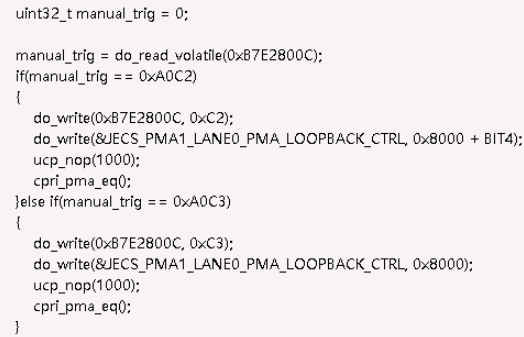 思朗反馈,让把上图加入代码,当出现异常的时候,执行 devmem 0xB7E2800C 32 0xA0C2 (CPRI切成PMA回环模式)。
