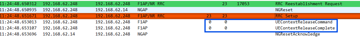 1)重建立走新建,下发msg4后打桩构造CU收到新UE上下文释放请求消息,观测新UE释放完成后会释放旧UE。