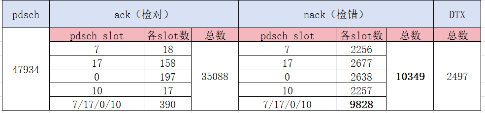 log中看到 pdsch共处理35088 条,其中DTX 2497 条,几乎忽略不计。nack 10349条,其中绝大多数错在 7 /17 / 0 /10这样在 s时隙tdd切换的d时隙上。