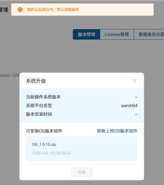 安装后界面“安装”按钮置灰,但是可以X掉弹框?,重新点击系统升级,可再次进入安装界面“安装”按钮高亮。实际系统未升级完成