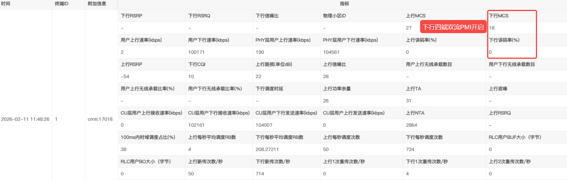 基于3.2.1pre1T2版本,替换gnb_du包,下行四端双流配置下关闭与开启下行PMI及RANK自适应前后下行MCS稍有提升,符合逻辑;