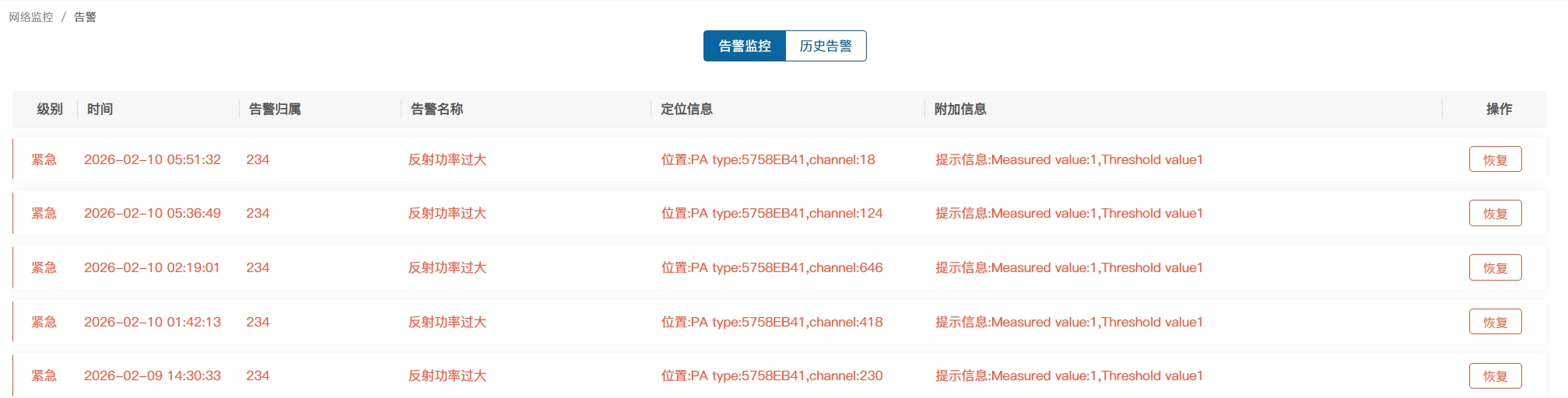 [3.0产品测试] 基站反射功率过大告警消除后,网管上告警没有恢复